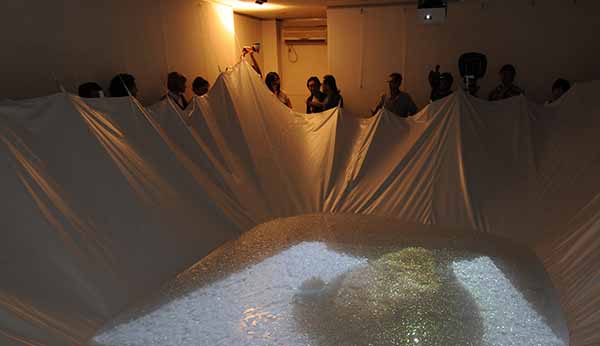 He projected turned over letter of "WATER' onto some hundreds of small bowls filled with water on the gallery floor. The letter "WATER" inversely projected suggests that it is not looked from human perspective but from nature's. The water in bowls vapours in the course of time and it reflects the weathering. As time passes, the original image of "WATER" becomes distorted. Yoo Dongjo represents his art as a part of nature and with this he conversely raises the ontological problems related to human essence. He casts some questions such as 'why we live like this?', 'How we live?', and 'What is fundamental agonies in our lives?' and he introduces these questions into his process of making art to find possible visions for human wellbeing. This makes him thinking about 'How can be art possible?' rather than 'What is art?'. He investigates art in the light of sophist approach of perceptive knowledge.