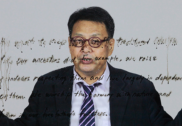 Yoo Dongjo‘s art talks about some conditions which can be recovered by human activity(art). Those conditions can not be fulfilled, but he wishes his art contribute to offer viewers healing chances and guide them toward the realm of human wellbeing in terms of recovery of balances exploited by value judgement. His artistic concept of harmony is revealed eminently by <Tears of Glaciers, 2009> and <Breath on Greenland, 2012>. <Dream of Minority Races in the Arctic Circle, 2014> shown in Daejeon Municipal Museum is a current version of <Breath on Greenland, 2012>. In this work, frost on the surface of glass panel onto which a video is projected, becomes melting down by the actor's breath and the text written on the glass panel becomes smudged along with the molten frost. This is a work about destroyed and contaminated natural environment of Greenland because of the development of natural resources by western countries, and artist's anguish is revealing with the speed of melting frost. The frost on the surface of glass panel metaphors melting glaciers.