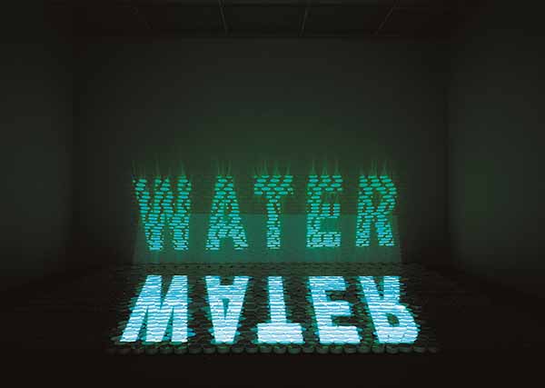 In a boat, the artist plunges the stone on which one upside down character had already been engraved. Only when the stone stands and meets water, we can see the right shape of each letter of a word, WATER, in upside-down form, on the surface of real water which reflects it.